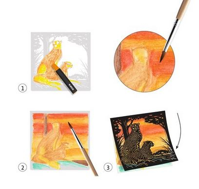 Urmând pașii prezentați copii pot învăța cum să folosească creioanele acuarelă, să dilueze culorile și să obțină tonuri diferite, creând jocuri de lumină. Peste desenul lor, suprapun planșele pretăiate (contururile negre), care dau spațialitate și aduc niște detalii deosebite tabolurilor finale.