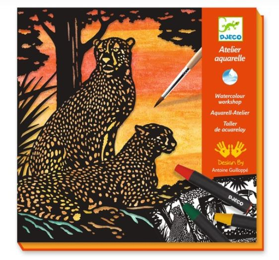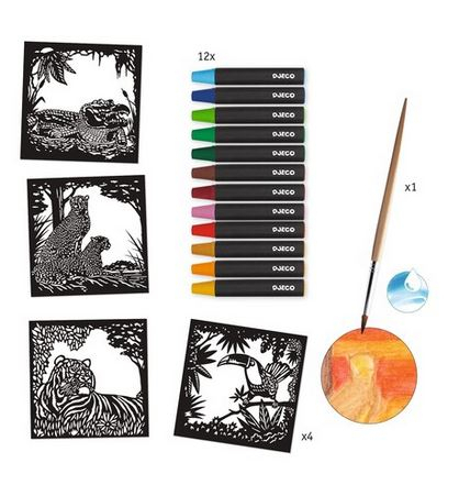 Conține: 4 planșe, 12 creioane acuarelă, 1 pensulă, 1 lipici, manual cu instrucțiuni.