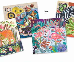 Conține 4 planșe predesenate, 6 tuburi cu sclipici colorat, un instrument de lucru, o pensulă și o carticică cu instrucțiuni în imagini, pas cu pas.