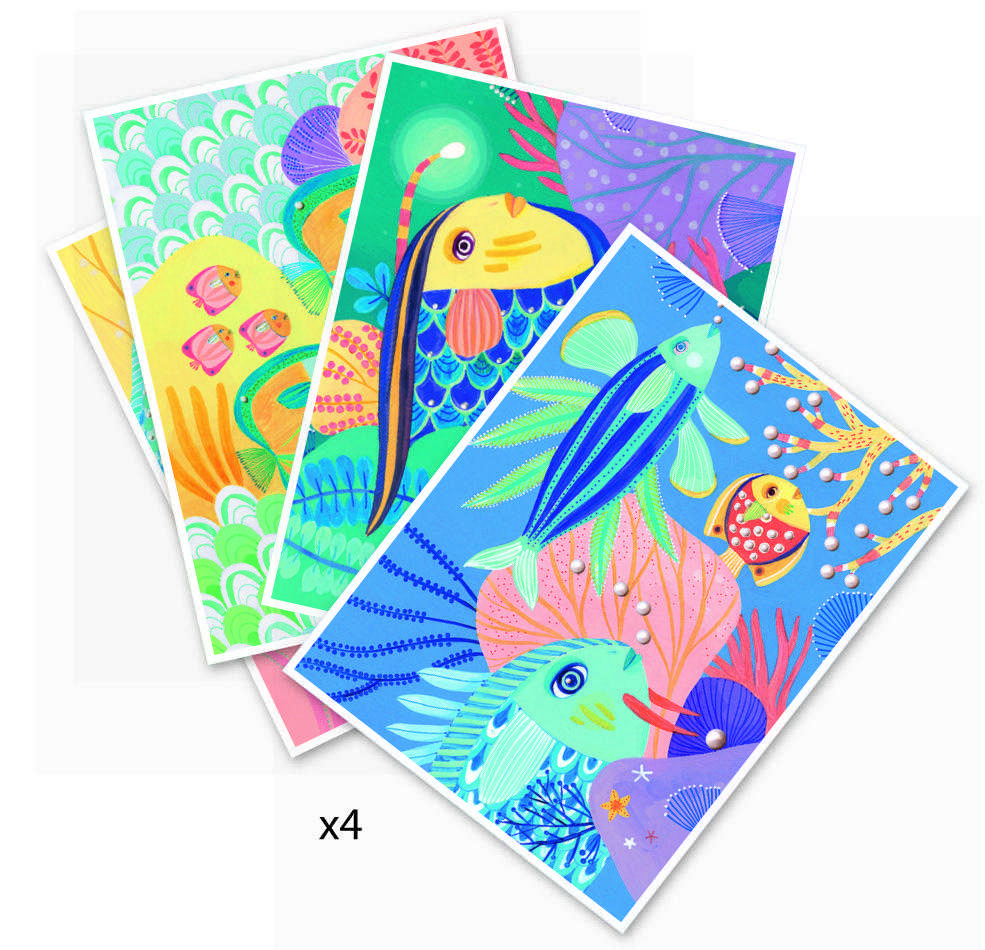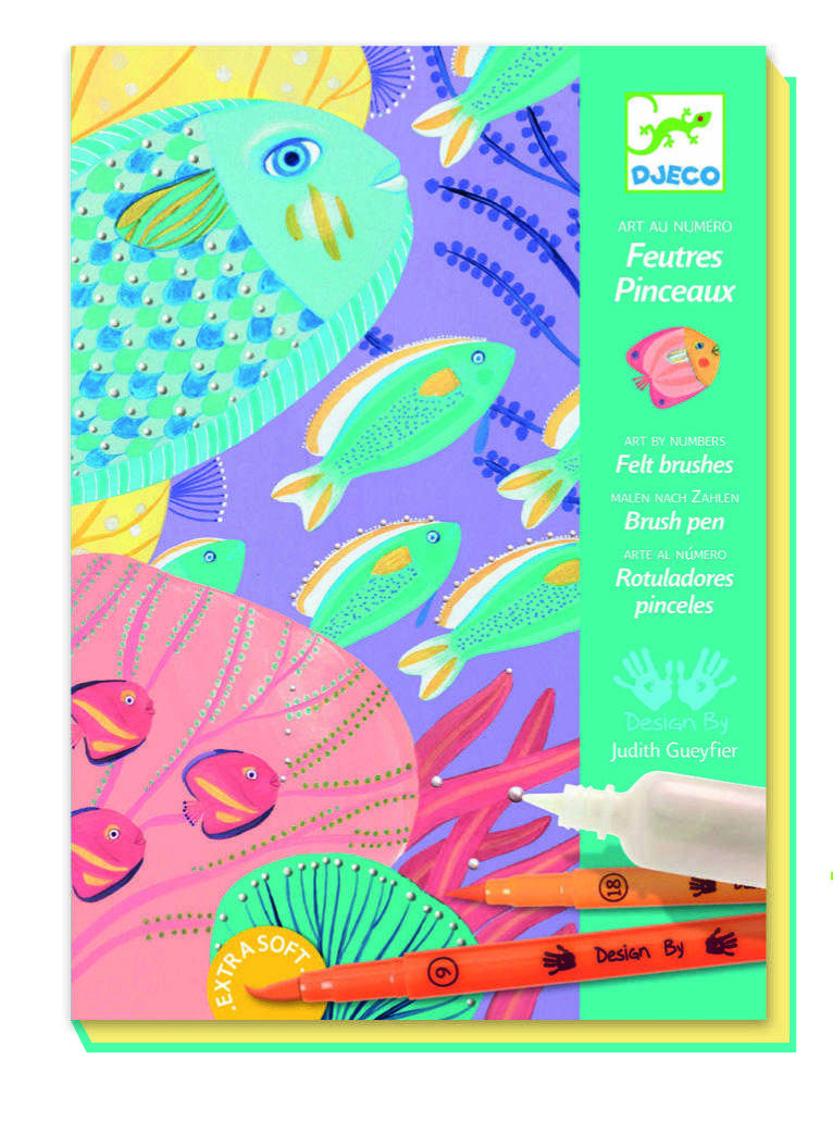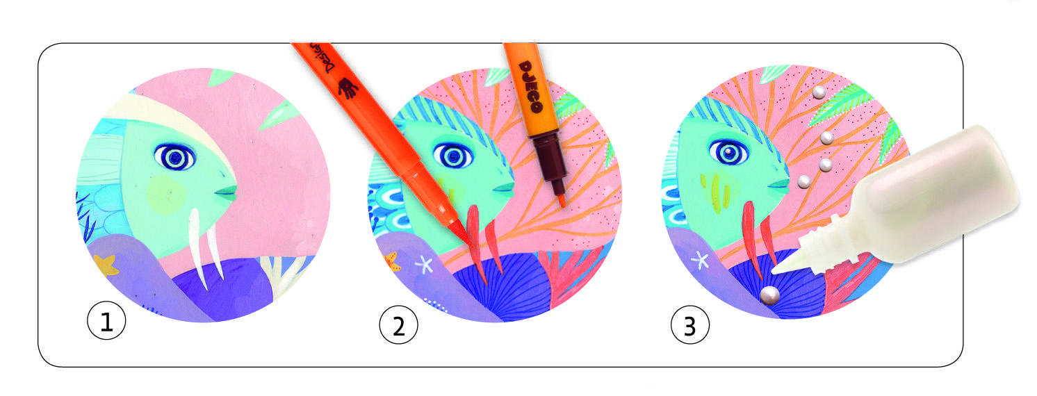 Set creativ cu planșe pentru desen. Conține 4 planșe preilustrate, 5 carioci pensulă cu două capete, unul tip pensulă si celălalt subțire, 1 sticlă cu vopsea perlată pentru decorul final, manual de instrucțiuni.
