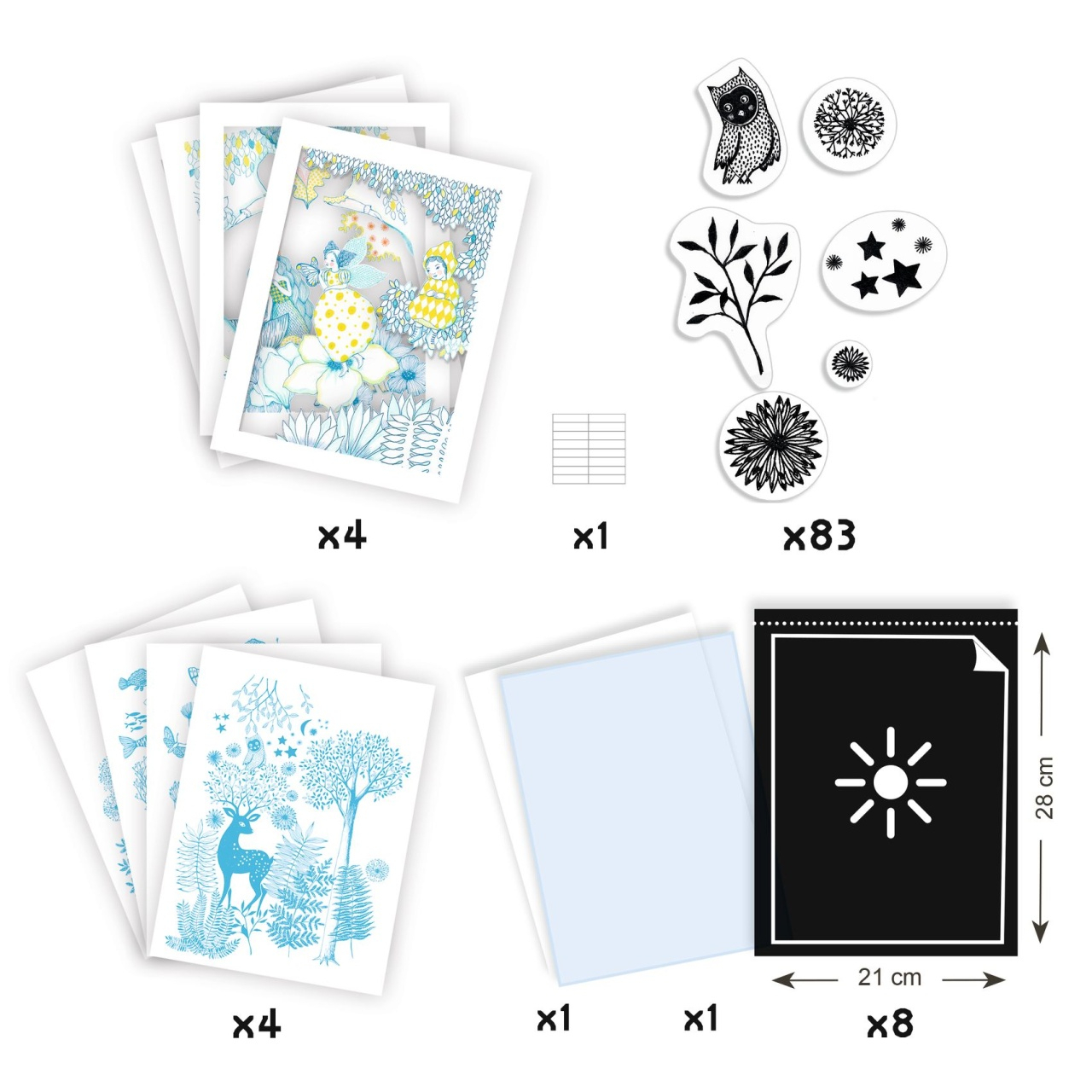 Atelier creativ In lumina lunii, Djeco Atelier magic inspirat dintr-un procedeu împrumutat din fotografie: cianotipia. Folosind modele opace și elemente naturale la alegere, copilul creează scene pe hârtie fotosensibilă. După expunerea la soare, hârtia este marcată cu modele negative. După ce clătește hârtia într-o baie de apă limpede, se dezvăluie scena pe un fundal albastru! Modele inspirate din natură pentru a crea 4 opere de artă nocturne și poetice. O abordare cu totul nouă a ilustrației prin imprimarea de modele pe peliculă de acetat! Fiecare creație este unică. O activitate care poate fi repetată, datorită rezervelor de hârtie pentru cianotip (vândute separat, cod DJ09338). Rame elegante tăiate cu laser pentru a transforma fiecare creație într-o adevărată capodoperă!