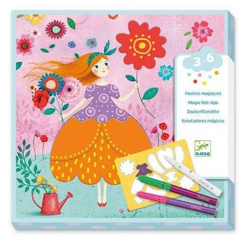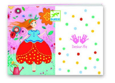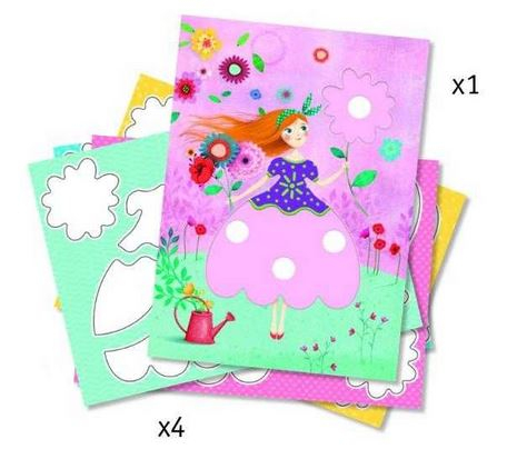 Conține 4 planșe imprimate cu șabloane pentru hainele fetiței, 1 planșă cadru pe care se pot schimba șabloanele (ținutele diferit colorate), 8 culori și o cărticică de instrucțiuni prin imagini, pas cu pas.