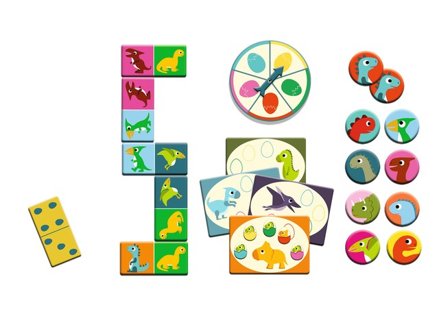 Un început perfect pentru joaca celor mici. Setul conține 3 jocuri diferite: de memorie (30 de piese rotunde), Bingo (25 de piese- ruletă, 4 planșe suport și piesele care trebuie completate), Domino (28 de piese cu fețe diferite- pe o parte au ilustrații cu dinozauri și pe o parte au numere)
