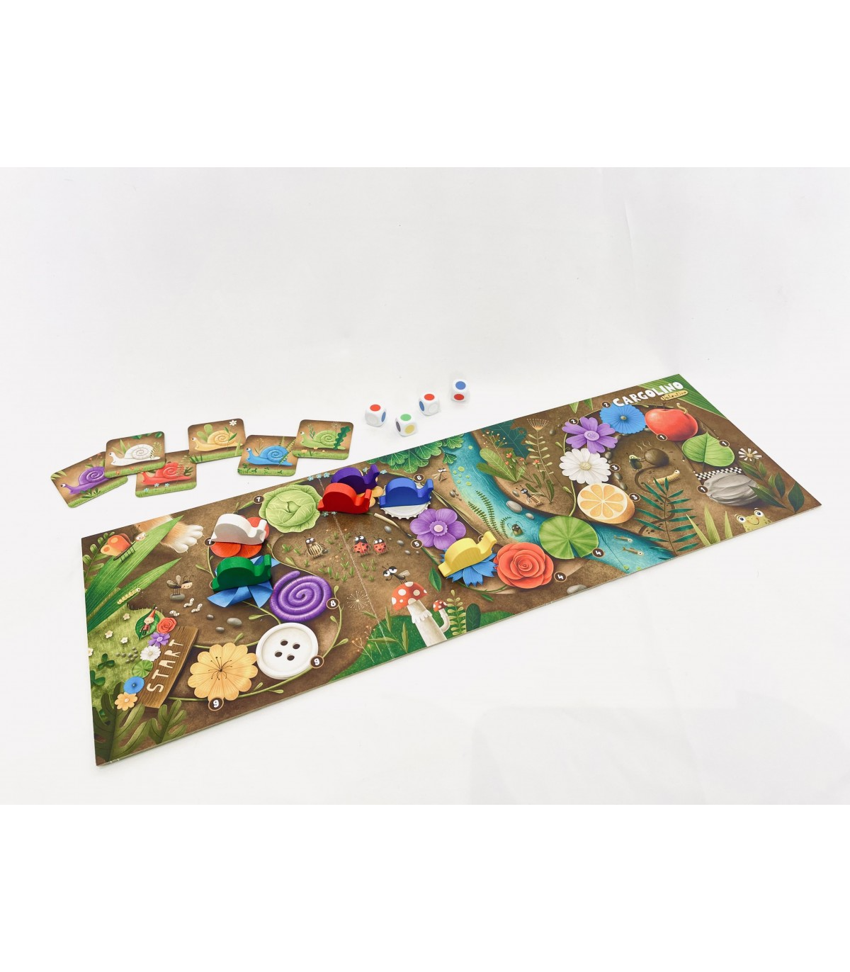 CONȚINUT: - Patru zaruri colorate - Șase melci de lemn - Șase jetoane melc - 1 Planșă de joc - 40 de jetoane cochilie - Instrucțiuni