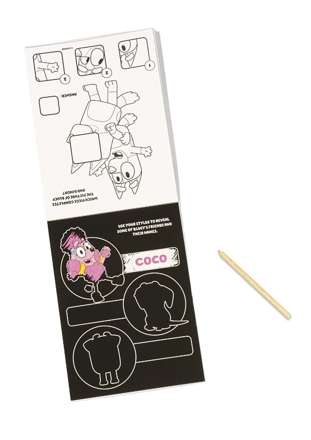 Ce urmeaza sa apara? Cu acest carnetel cu activitati creative te vei distra super bine! Pe masura ce razuiesti paginile apar imagini amuzante cu Bluey, Bingo, parintii si prietenii lui. Te asteapta 12 pagini de razuit, fiecare cu un joculet distractiv, o ghicitoare sau o pagina de colorat pe spate.