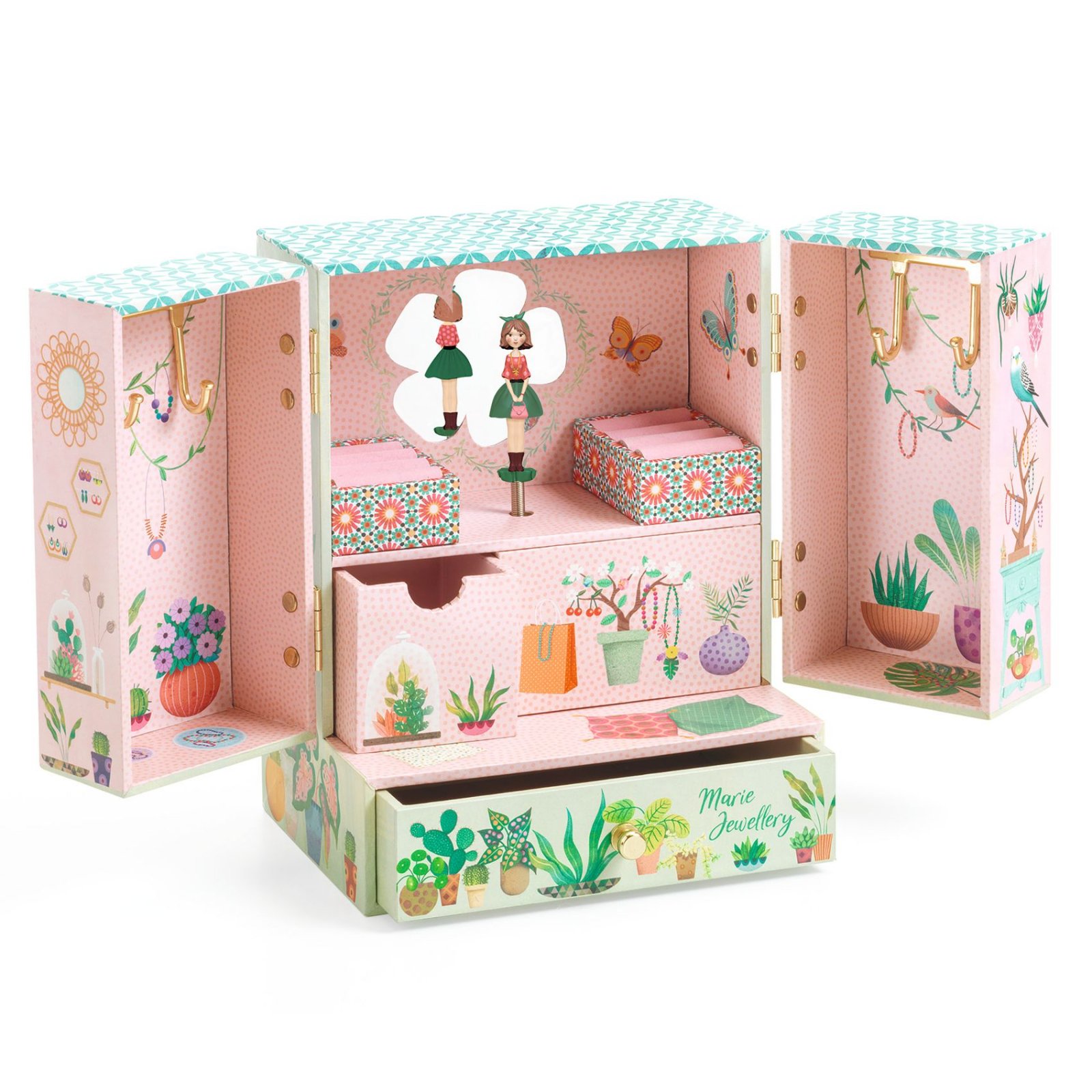 Cutie muzicala Gradina secreta Cutie muzicală cu decor grădină luxuriantă, cu un sertar mare și unul mic pentru depozitarea bijuteriilor și a lucrurilor secrete. Are, de asemenea, două suporturi pentru inele și patru cârlige aurii pentru agățarea colierelor și brățărilor.