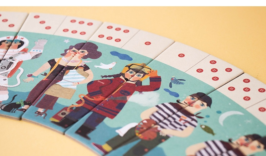 Domino circular Meserii Găsește cea mai frumoasă meserie. Variantă educativă a jocului de domino Domino de formă circulară, atunci când toate piesele sunt aranjate, setul având un diametru de 56 cm. Conține 28 de piese, cu care poți construi personaje cu meserii diferite și numere. Câștigă jucătorul care își termină primul piesele. Confecționat din carton reciclat, ecologic, conform reglementarilor EN71&ASTM. Vârsta recomandată: + 3 ani. AVERTISMENT: Contraindicat copiilor sub 3 ani, conține piese mici, pericol de sufocare. A se utiliza sub directa supraveghere a unui adult. Producător: Londji, Spania