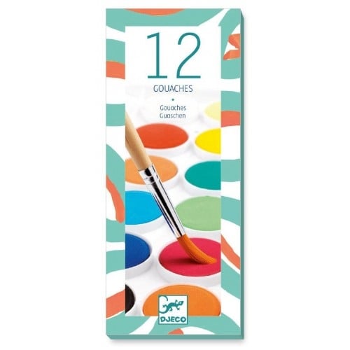 Set de 12 guașe, cu pensulă, confencționate din materiale și culori non-toxice.