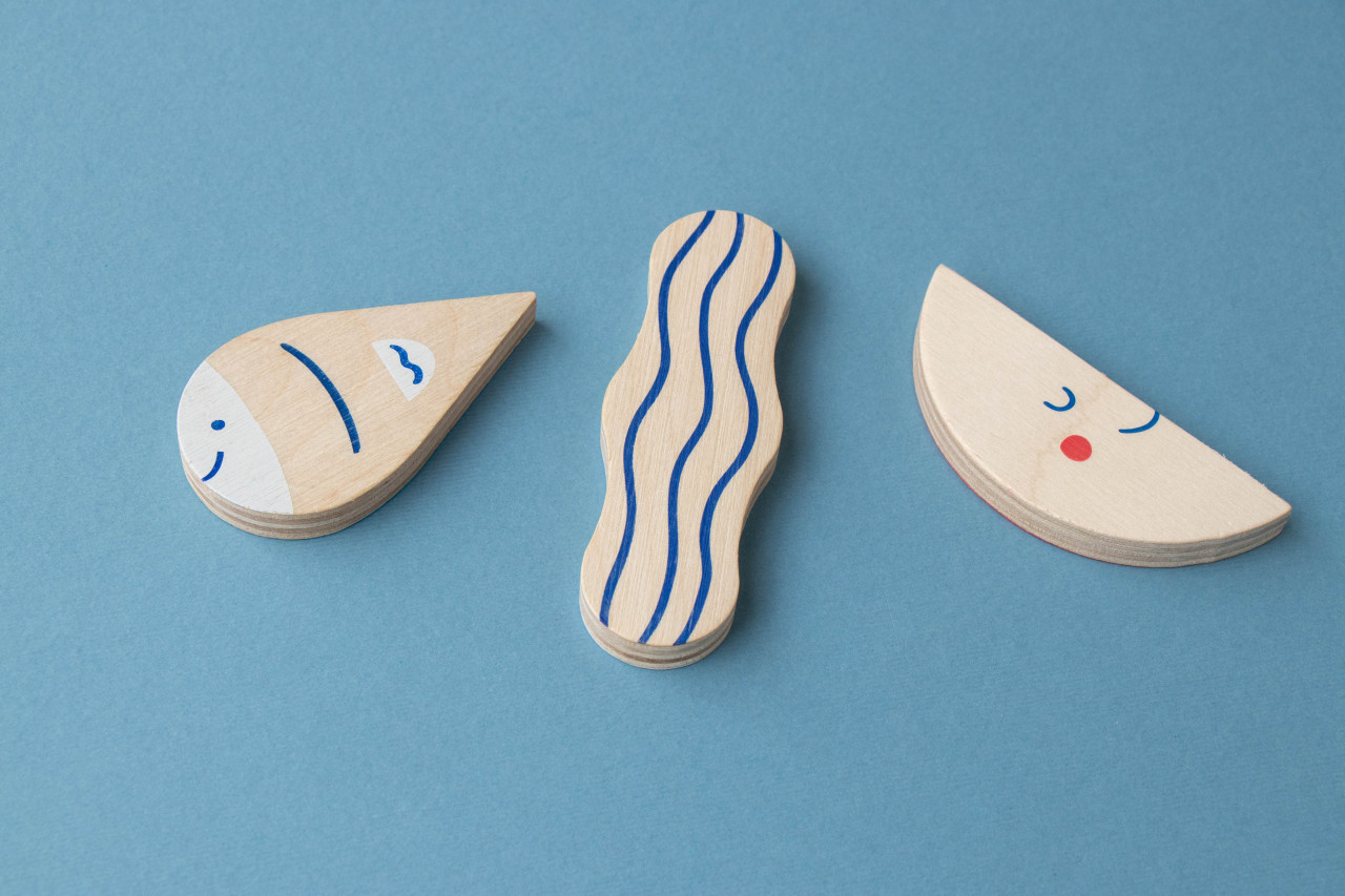 4 puzzle-uri din 3 piese și 3 piese din lemn care completează puzzle-urile.