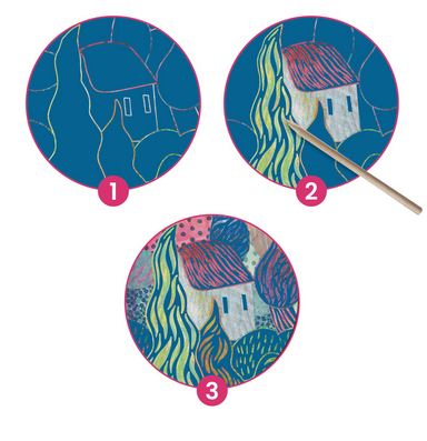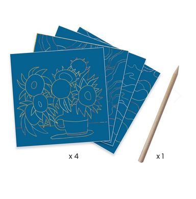 Un set cu planșe de răzuit care îi invită pe copii să descopere stilul lui Van Gogh, marele maestru al curentului fauvism. Folosind instrumentul din lemn inclus, se ”zgârie” suprafața planșelor, dezvăluind modelele detaliate imaginate de ilustrator. Astfel, compozițiile sunt dezvăluite treptat și peisajele prind viață. Ce distractiv este să descoperi ilustrațiile ascunse!