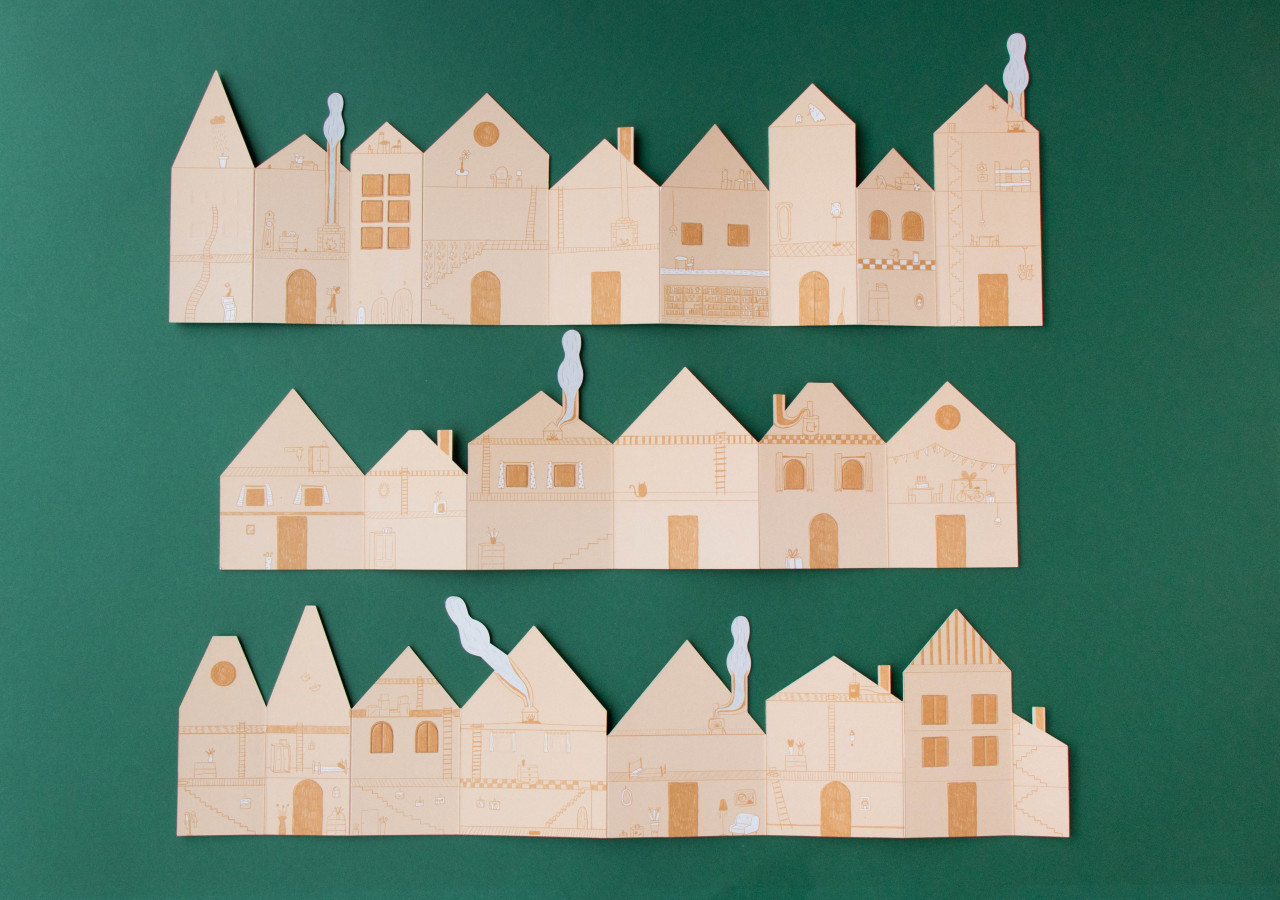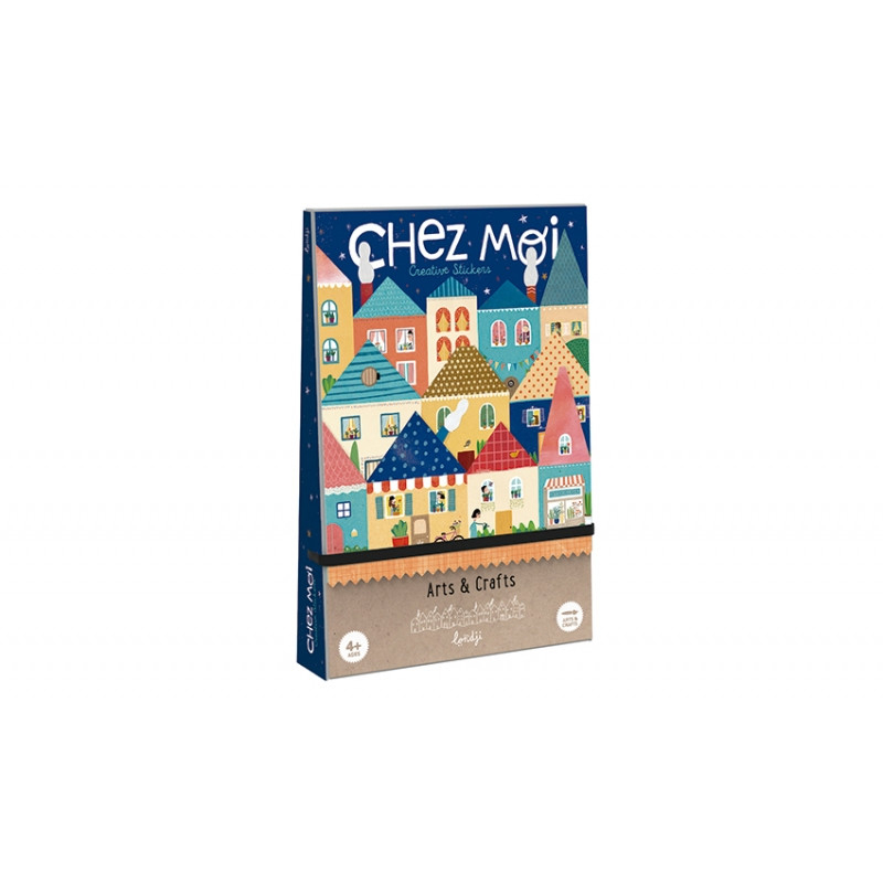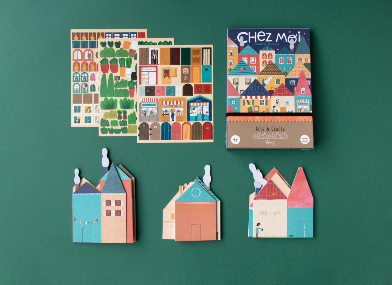 Setul conține 3 cartonașe cu case pliabile (66 x 15 cm) și 185 de autocolante detașabile pentru decorat casele.
