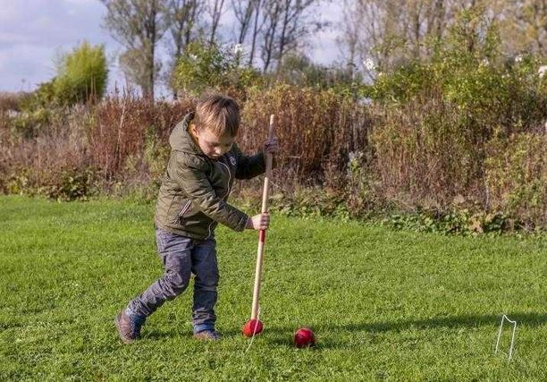 Un joc clasic, numai bun de jucat în grădină! Bilele din lemn trebuie să treacă printr-o serie de porți instalate pe traseul de joc.