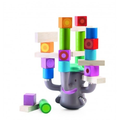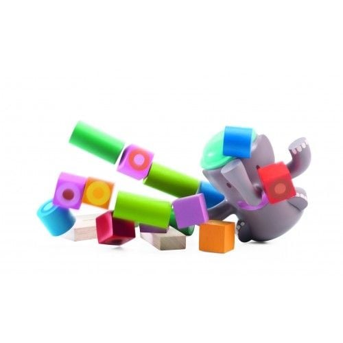 20 de cuburi din lemn de diferite dimensiuni, forme și culori, pe care copilul trebuie să le suprapună pe piesa de bază. Elefantul pe care se așează cuburile are partea de jos ușor curbată, atentie deci, totul se poate prăbuși atunci când piesele nu sunt în echilibru.