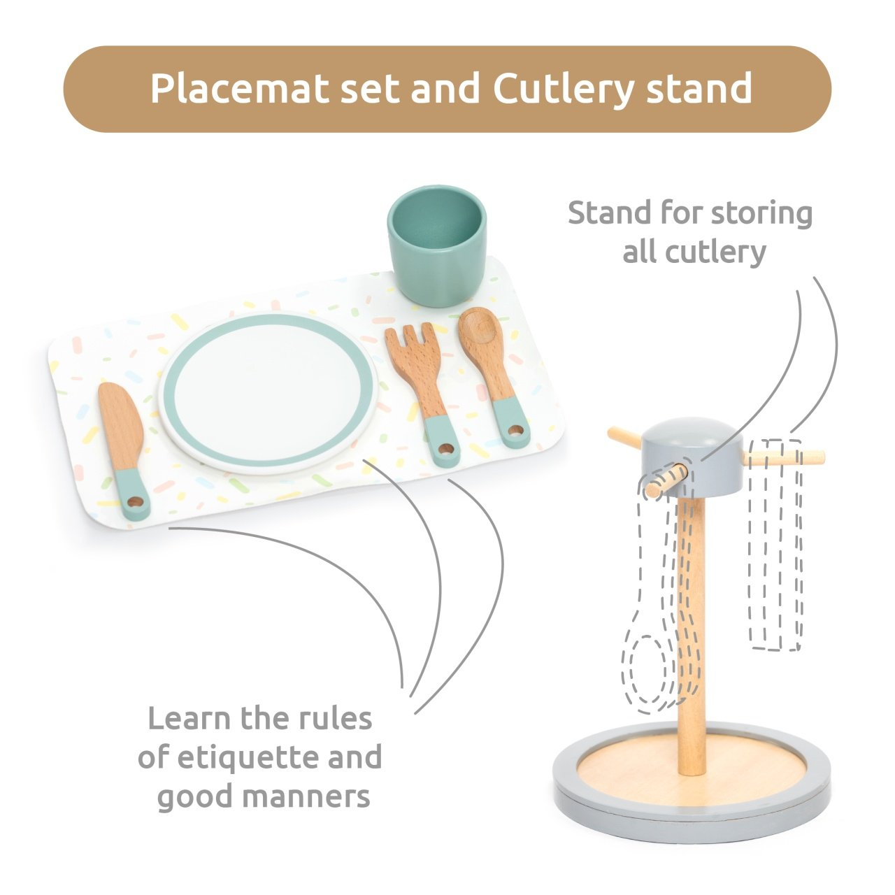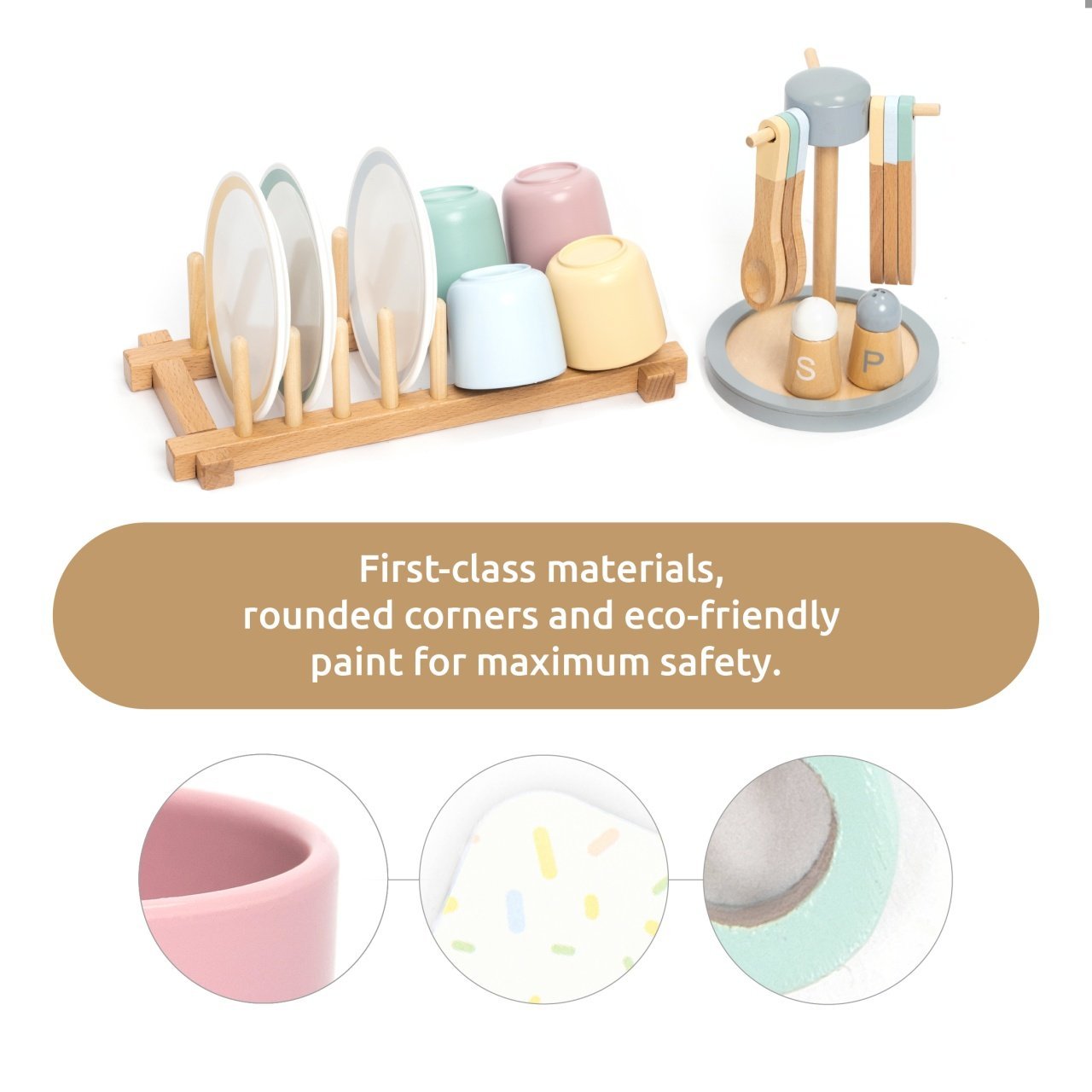 Joc de rol Set complet pentru servirea mesei Set de joacă cu toate accesoriile necesare servirii mesei. Copiii preșcolari își pot dezvolta prin joc abilități cognitive și motorii importante (coordonarea ochi-mână). Cadou ideal pentru zile de naștere, Crăciun, Paște sau Ziua Copilului. Conținut: 33 piese din lemn - farfurii, tacâmuri, pahare, suporturi. Piese cu margini netede și durabilitate ridicată.