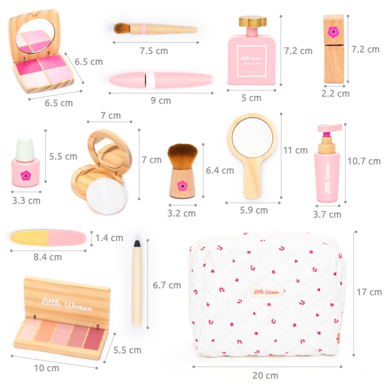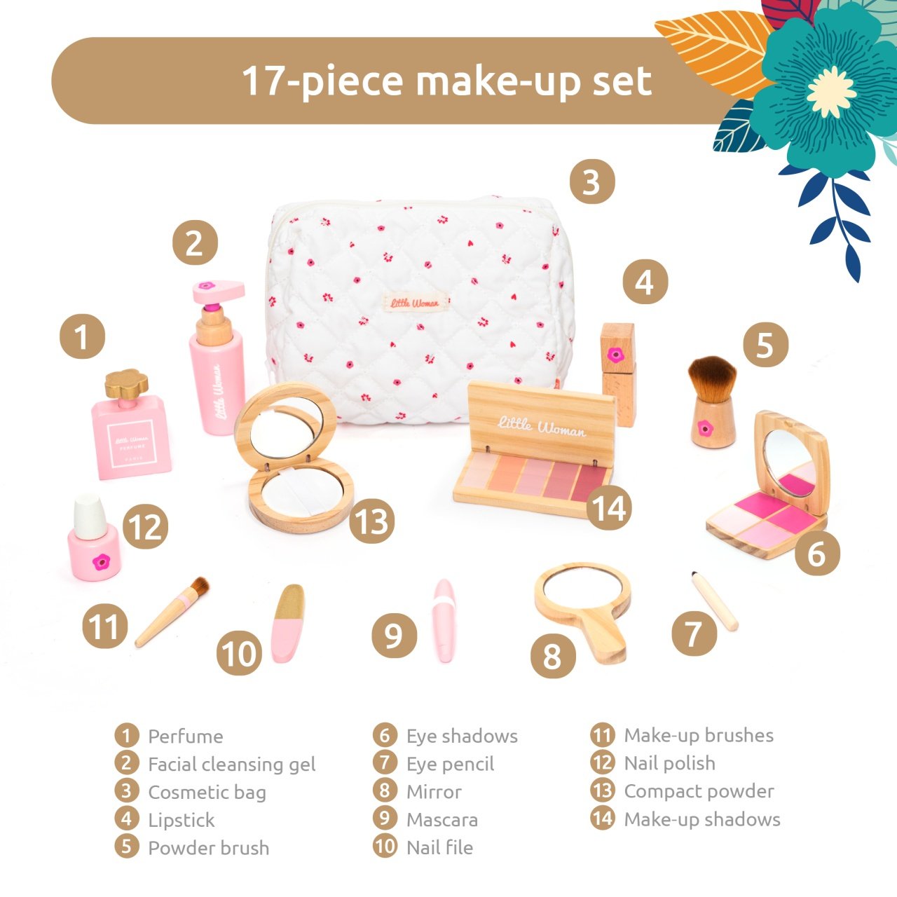 Joc de rol Trusa make-up Setul make-up din lemn pentru copii conține 17 piese de cosmetică și machiaj într-o gentuță necessaire cocheta. Dezvoltă creativitatea, imaginația, gândirea, memoria, limbajul și abilitățile motorii ale copiilor (coordonarea ochi-mână). Conținut: 16 piese din lemn, gentuță cosmetică. Piese durabile cu margini rotunjite. Vârsta recomandată: +3 ani. Confecționat din lemn cu vopsele ecologice pe baza de apa, textil. Conform normelor EN71&ASTM cu certificare CE. AVERTISMENT: Contraindicat copiilor sub 3 ani! Poate conține piese mici, pericol de sufocare. Se recomandă supravegherea copilului de către un adult în timpul jocului. Produs în China pentru UMU Toys, Cehia.