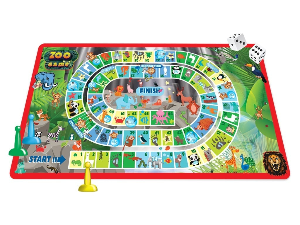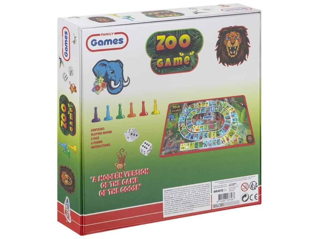 Regulamentul jocului: Aseaza tabla de joc pe o suprafata plana si impartiti cate un pion colorat fiecarui jucator. Unul dintre jucatori incepe jocul. Jucatorul da cu zarurile si avanseaza pe casutele de pe tabla de joc conform numarului obtinut si va efectua, daca este cazul, actiunea de pe spatiul de joc Primul jucator care ajunge la linia de "Finish" castiga! Continutul jocului: O tabla de joc 6 pioni colorati 2 zaruri Dimensiune ambalaj: 27 x 27 x 5 cm Varsta recomandata: 5 ani+