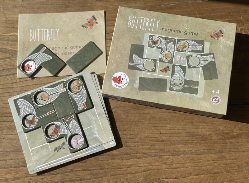 Obiectivul jocului: Așază toate piesele magnetice pe tablă astfel încât fiecare fluture să apară în ferestrele rotunde.