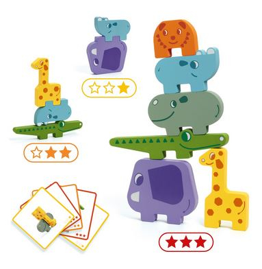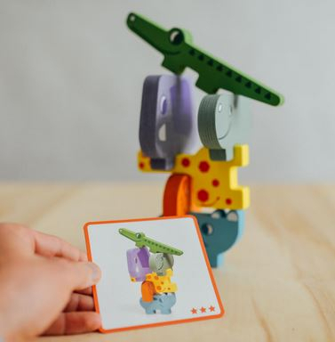 Conține 20 de cartonașe cu diferite grade de dificultate pentru dezvoltarea motricității și coordonării, 6 figurine animale din lemn.