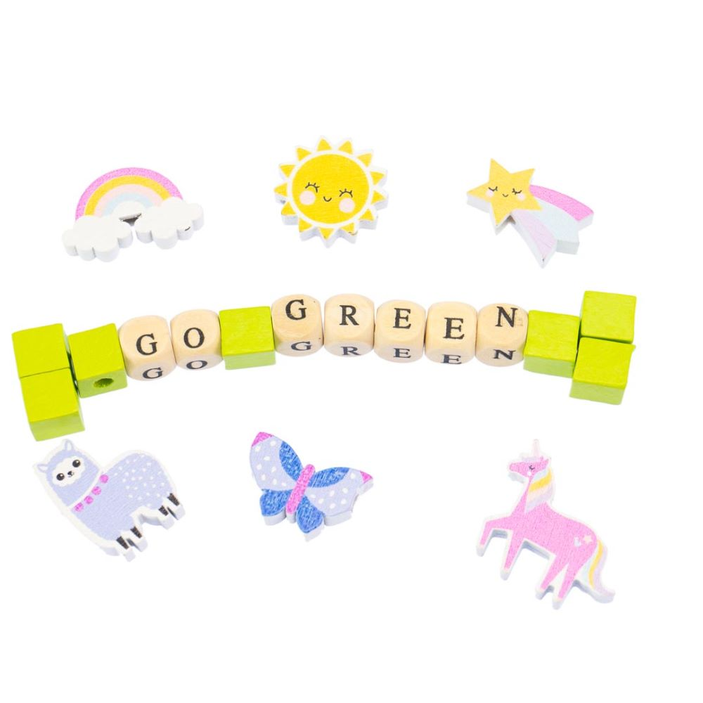 Kit de mărgele din lemn assortite pentru a crea brățări și coliere originale și creative pentru copii, într-o cutie eco-friendly. Distracție garantată pentru a compune decorațiuni, a inventa combinații noi și a adăuga culoare stilului tău personal cu mărgele sustenabile!
