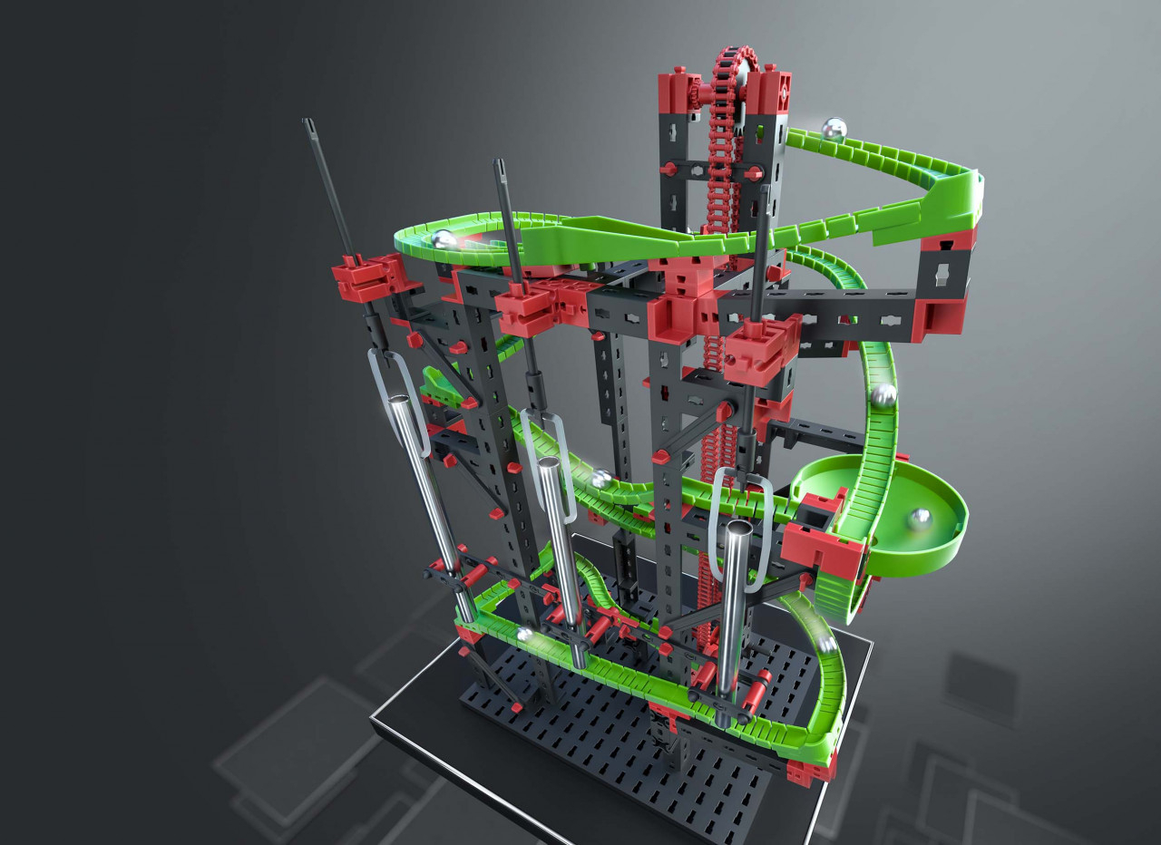 Kit STEM Dynamic M, Cursa cu obstacole cu bila metalica Noi componente ce creeaza sunet și acțiune deschid și mai multe posibilități pentru curse distractive! În timp ce se întrec în cursele cu obstacole, bilele metalice creează tonuri melodice. Pâlnia rotativă oferă o modalitate complet nouă de a aduce bilele pe următoarea șină. De asemenea, bilele vor zbura prin cursa cu obstacole, prin intersecții și curbe înguste. La sosirea bilelor la capătul cursei, ridicarea manuală cu lanț le aduce înapoi la start. Setul de construcție Dynamic M este ideal pentru construirea a 4 piste, distractive și interesante.