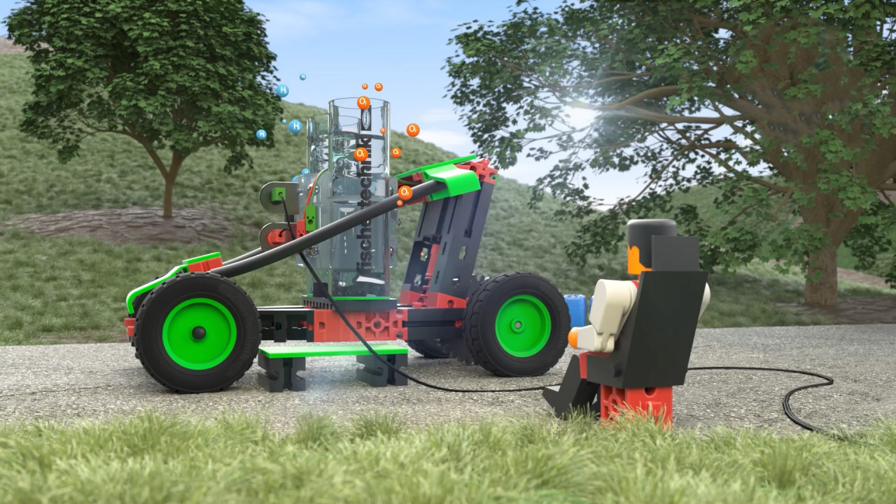 Kit STEM Masina alimentata cu hidrogen, Kit de constructie cu tehnologie avansata Hidrogenul și pilele de combustie - una dintre cele mai promițătoare tehnologii energetice și un subiect cu care industria auto se ocupă de ceva timp. Un lucru este clar - avem nevoie de energii alternative care vor înlocui în cele din urmă combustibilii fosili. Copiii au ocazia să abordeze acest subiect important într-un stadiu incipient, descoperind astfel lucruri interesante în domeniul energiilor alternative. Kit pentru a construi o mașină cu pile de combustie și a o pune apoi în mișcare cu ajutorul hidrogenului. Întrebărilor precum "Cum funcționează o pila de combustie cu hidrogen și cum poate fi produs hidrogenul?" le sunt oferite răspunsuri simple și ușor de înțeles prin intermediul modelului practic. Folosind electrolizorul celulei de combustie reversibilă, de exemplu, se poate observa cum se pot obține hidrogen și oxigen din apă, care, la rândul lor, asigură generarea de energie electrică și conducerea fără emisii. Instrucțiuni de asamblare pentru a construi un model de motor alimentat cu hidrogen.