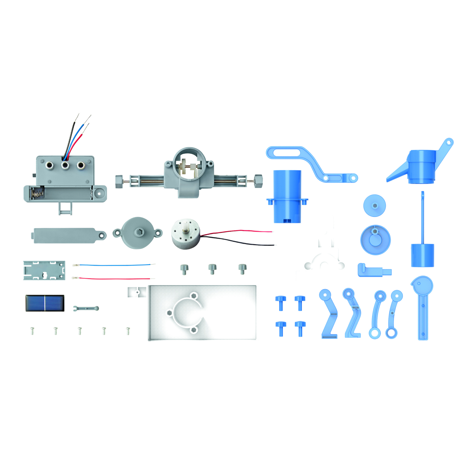 Conține cutie de viteze, modul baterie, partea superioară a cilindrului, conector piston, bază pompă, cadru principal, îmbinare panou solar, piston, bază cilindrului, cilindru mijlociu, conector cilindru, chei, articulație mic angrenaj, brațe figurine, picioare figurine, conector figurină, corp figurină & cap, articulație mare angrenaj, bază panou solar, panou solar, capac baterie, capac motor, decupaje frontale (din ambalajul cutiei), motor, fire panou solar, capace terminale x 3, șuruburi mici x 5.