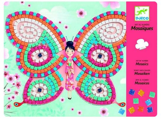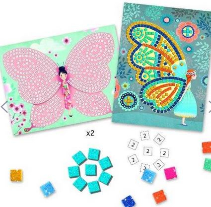 Două imagini mozaic. Prin lipirea pieselor mici se formează 2 tablorui cu fluturi prietenoși.