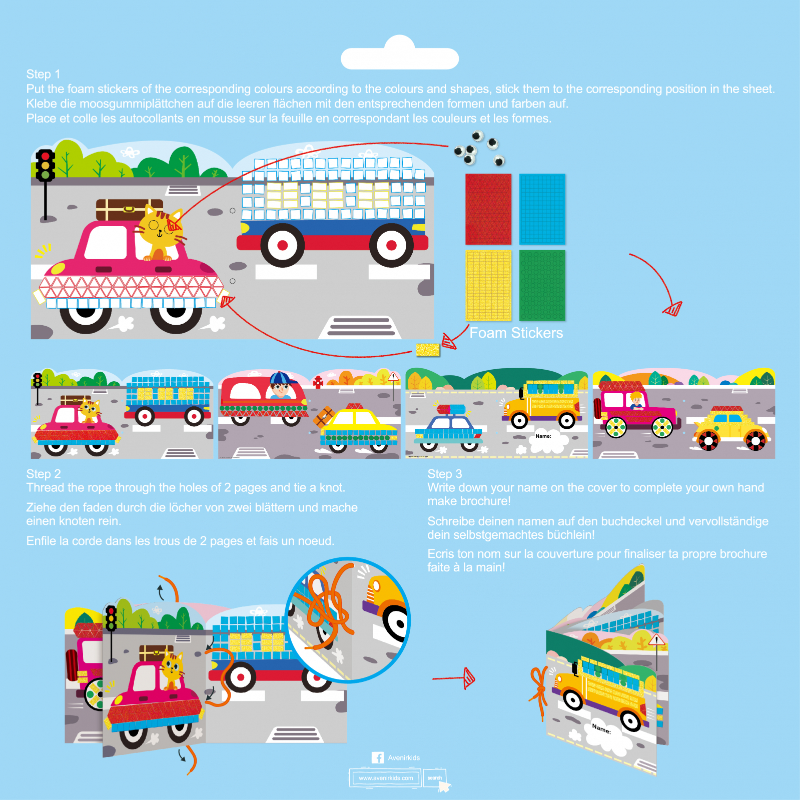 Contine: 2 carduri cartonate; 4 foi cu autocolante din spumă; 6 ochi; 1 sfoara