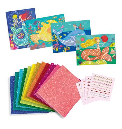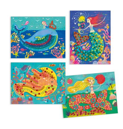 O introducere în tehnica mozaicului pentru începători. 4 modele de completat cu pătrățele de spumă strălucitoare și autocolante cu ștrasuri. Copiii caută numerele, apoi lipesc piesele în locurile potrivite de pe planșă. Pe măsură ce planșele sunt acoperite cu decorațiuni, apar sirenele strălucitoare în mijlocul valurilor.