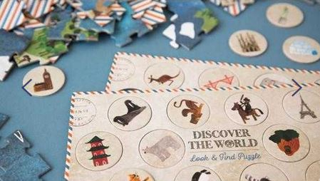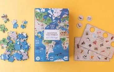 Puzzle și joc în același cadou. Asamblează puzzle-ul și călătorește în jurul lumii pentru a găsi monumente, animale și atracții specifice.