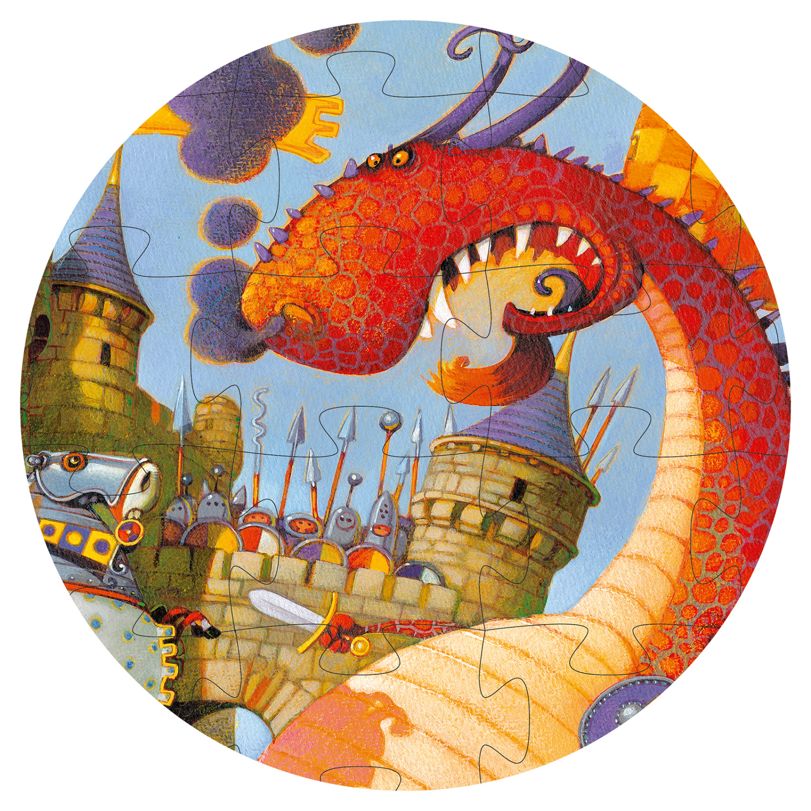Puzzle Cavalerul si Dragonul Un cavaler curajos se luptă cu dragonii pentru a salva prințesa. Un puzzle de 54 de piese într-o cutie decorativă în formă de castel. Dimensiune puzzle asamblat: 37 x 40 cm. Vârsta recomandată: +5 ani. Confecționat din carton non-toxic, conform reglementărilor EN71&ASTM. AVERTISMENT: Contraindicat copiilor sub 3 ani! Poate conține piese mici, pericol de sufocare. Se recomandă supravegherea copilului de către un adult în timpul jocului. Producător: Djeco, Franța