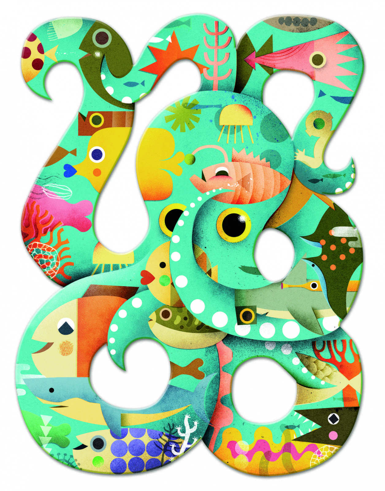 Puzzle Octopus Puzz’Art Octopus este un puzzle cu 350 de piese fără colțuri și fără margini drepte. Acest nou format de puzzle transformă complet puzzle-urile tradiționale! Pe măsură ce copiii împletesc puzzle-ul o caracatiță va începe să prindă contur în fața lor, si un univers marin fascinant se va releva din tentaculele sale. Conține poster pentru a ajuta la finalizarea puzzle-ului. Dimensiune puzzle asamblat: 46 x 62 cm. Vârsta recomandată: + 7 ani. Confecționat din carton și hârtie certificată FSC, conform reglementărilor EN71&ASTM. AVERTISMENT: Contraindicat copiilor sub 3 ani! Poate conține piese mici, pericol de sufocare. Se recomandă supravegherea copilului de către un adult în timpul jocului. Producător: Djeco, Franța. Fabricat în Europa.