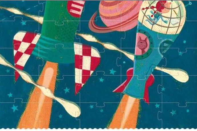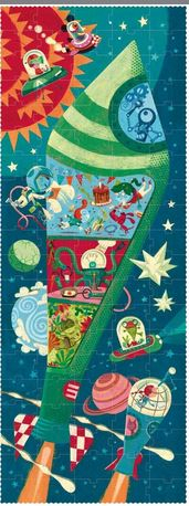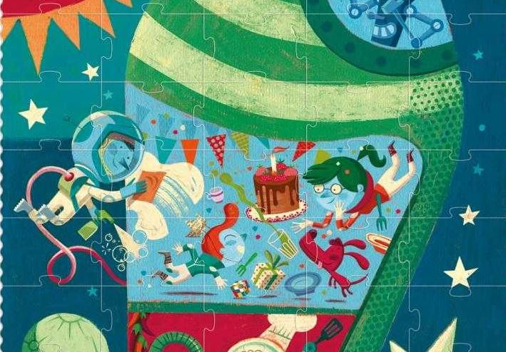 Puzzle cu 100 de piese. Dimensiune: 85 x 32 cm. Zborul către planete prietenoase este deosebit ilustrat de către Sebastià Serra.