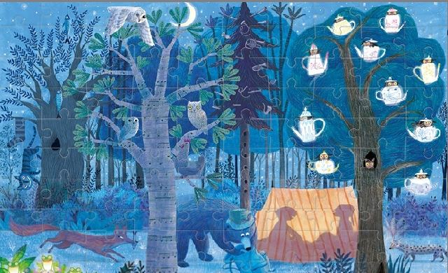Puzzle reversibil cu 100 de piese dublu ilustrate, pe o parte e pădurea în plină zi, pe cealaltă e în noapte.