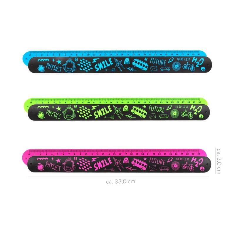 Descopera rigla snap-it, o inovatie 2 in 1 ce combina functionalitatea unei rigle cu designul unei bratari elegante, care straluceste in intuneric! Alege-ti preferata dintre cele trei culori neon la moda, fie ca esti fan al albastrului vibrant, al rozului jucaus sau al verdelui indraznet, toate cu stiluri grafice moderne. Cu un invelis placut la atingere, aceasta rigla devine rapid un accesoriu grozav pentru scoala si pentru viata de zi cu zi. Adauga o nota de stil si functionalitate in rutina ta de scoala sau in activitatile zilnice cu aceasta rigla, care nu doar ca este utila, dar si aduce un plus de distractie si stralucire in viata ta! Cu o lungime de 30 de centimetri, este perfecta pentru orice sarcina de masurare sau trasare.