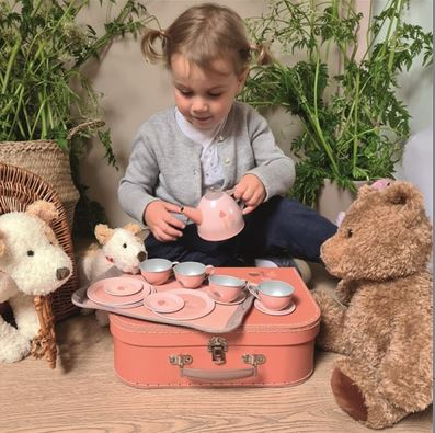 Setul conține: valiză cartonată, tavă, 4 lingurițe, 4 farfurii, 4 cești cu mâner și ceainic cu capac.