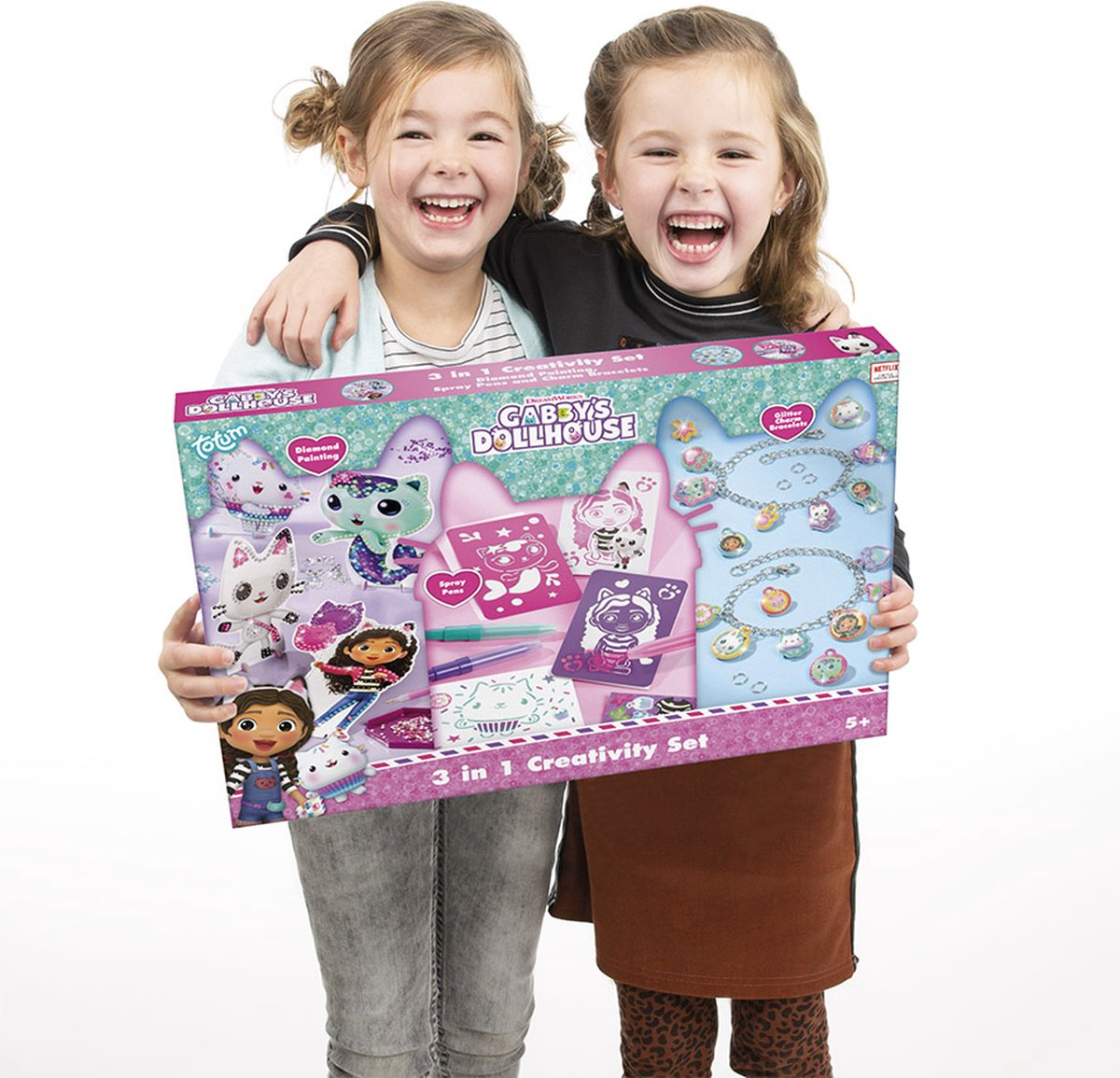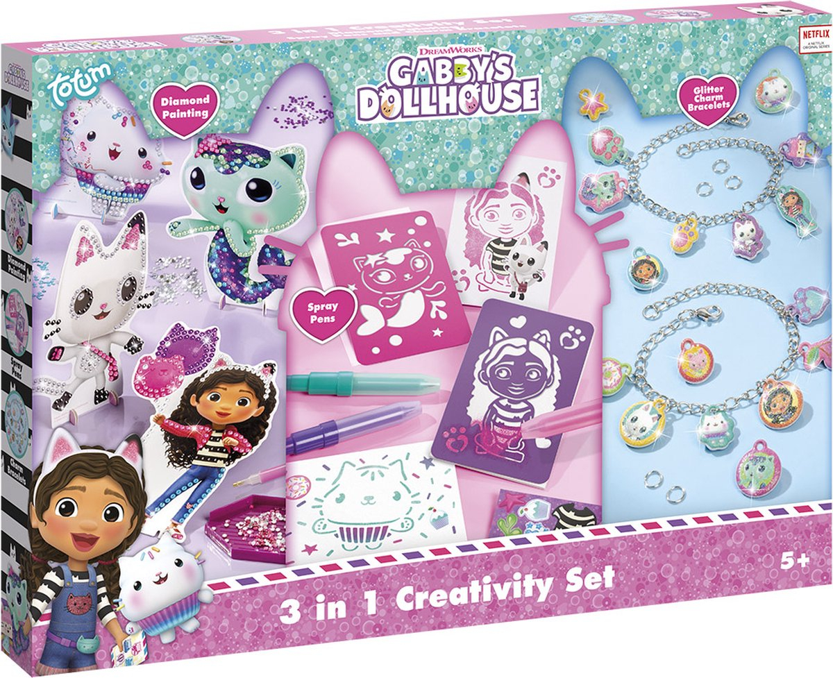 Un super cadou pentru mega distractie creativa alaturi de indragitele personaje din Gaby's Dollhouse. Creeaza propriile bratari, decoreaza cu tehnica diamond painting sau deseneaza cu cariocile spray! 3 activitati creative intr-un singur set creativ!