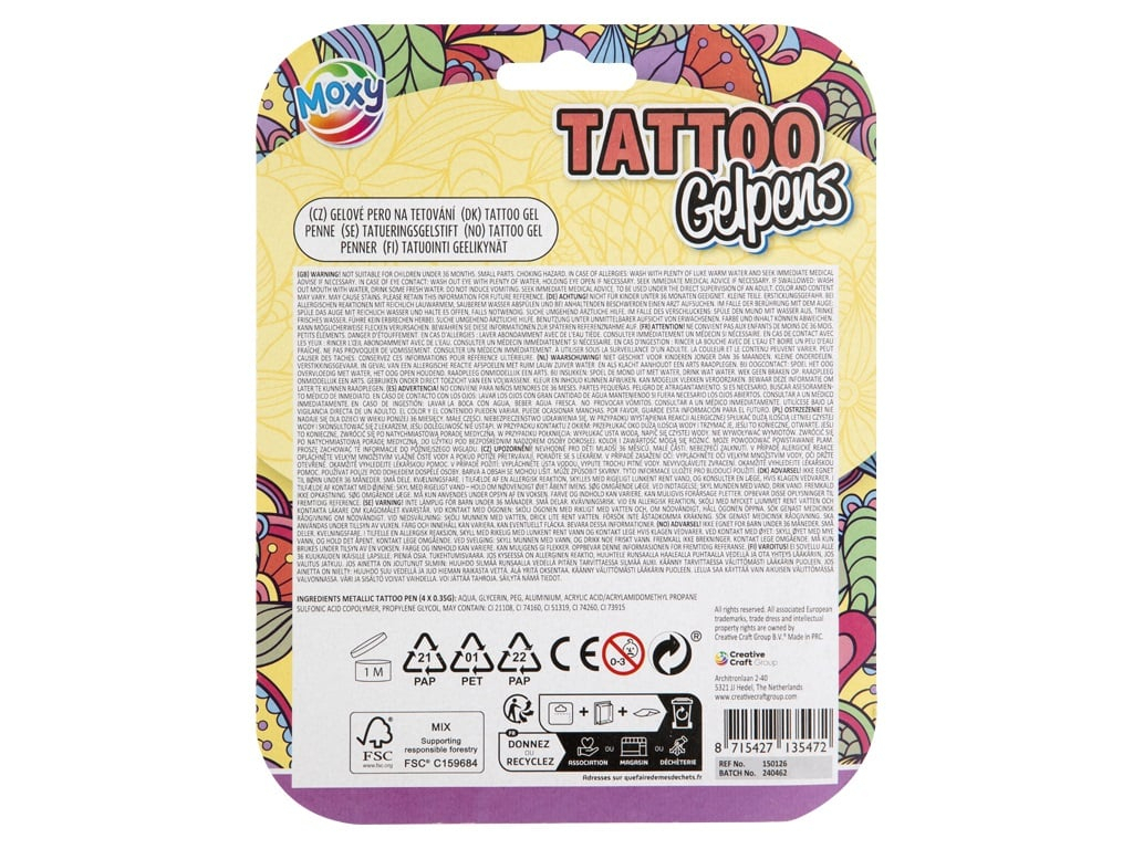 Acest set contine 4 pixuri special concepute pentru a crea tatuaje temporare cu efect metalic. Cu aceste pixuri, copiii isi pot lasa imaginatia sa zburde, desenand tatuaje stralucitoare si creative direct pe piele. Pixurile sunt usor de utilizat si sigure, fiind potrivite pentru pielea delicata a copiilor. Un mod creativ si distractiv pentru copii de a-si exprima stilul personal si de a crea tatuaje temporare colorate si stralucitoare!