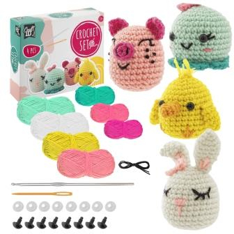 Indiferent daca esti incepator sau ai experienta in crosetat, acest set iti ofera tot ce ai nevoie pentru a da viata unor animale adorabile: un iepuras pufos, o caracatita vesela, un pui dragalas si un porcusor amuzant.