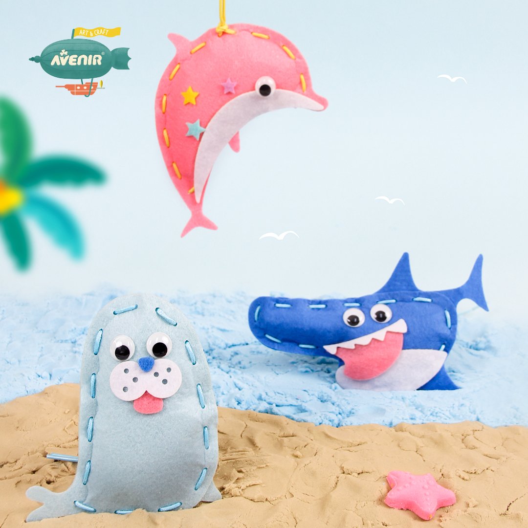 Acest kit conține 3 personaje adorabile cu tematică marina, împreună cu foi de pâslă pretăiate, autocolante decorative din pâslă, ochi de plastic, umplutură din bumbac și șireturi colorate.
