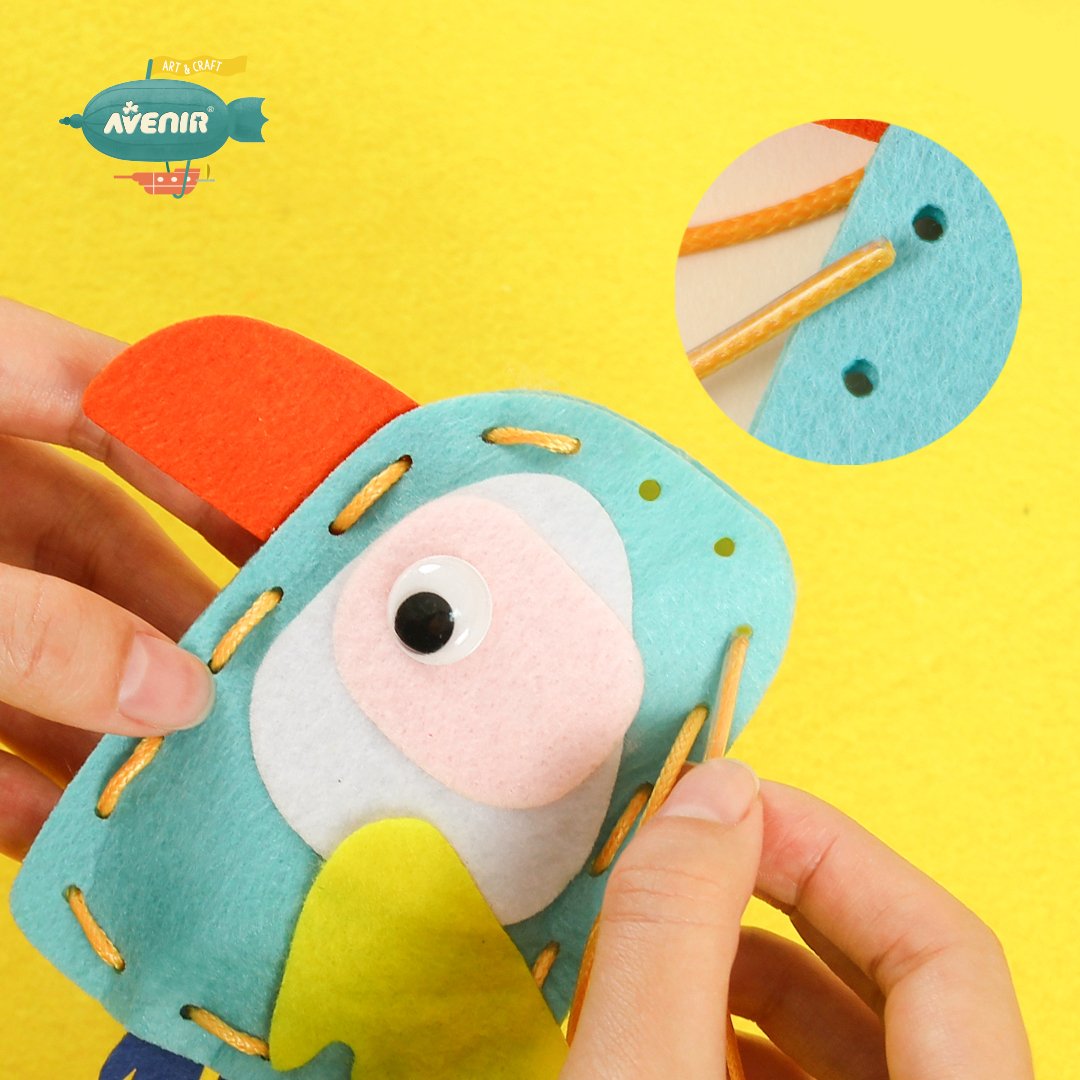 Nu este nevoie de ac - folosește un siret pentru a coase cele 2 bucăți împreună. Exersați abilitățile de insiretare și trasare. Folosiți autocolante decorative din pâslă pentru a decora.