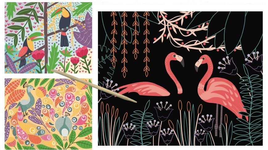Jocul contine 10 planse de razuit in care vei descoperi diferite specii de pasari - flamingo, pauni, tucan etc, frumos ilustrate. Setul include un creion de lemn, special pentru razuit.