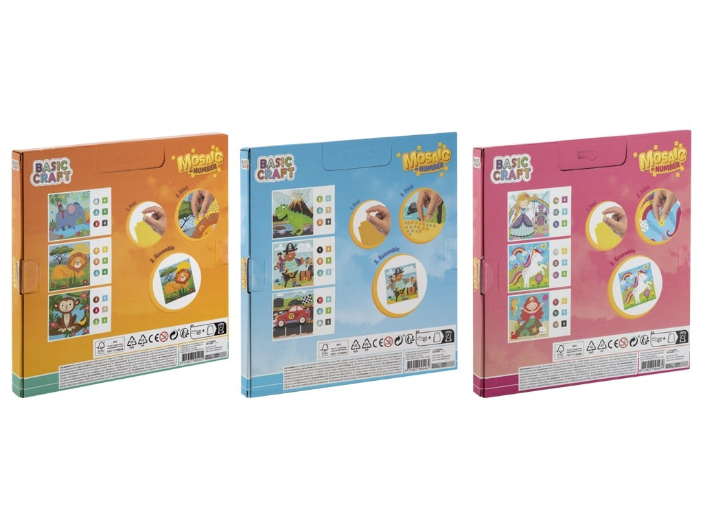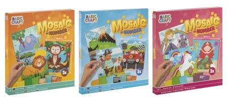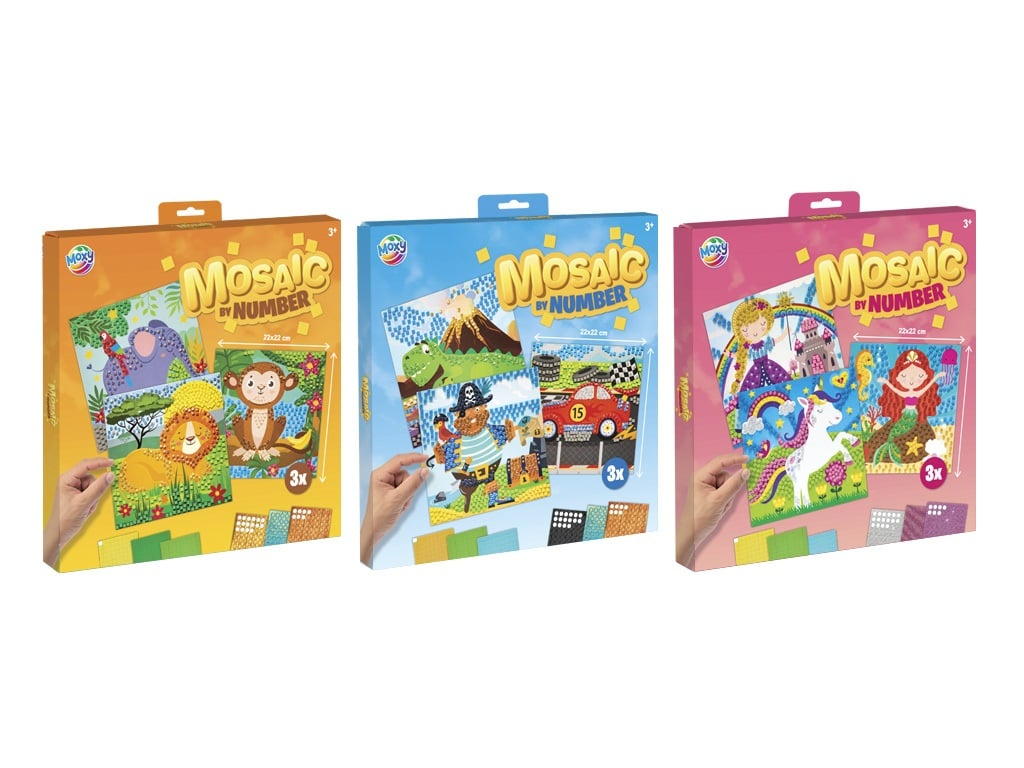 3 tablouri cu mozaic preimprimat: Fiecare tablou prezinta un design diferit, gata sa fie completat cu bucatile de mozaic incluse.