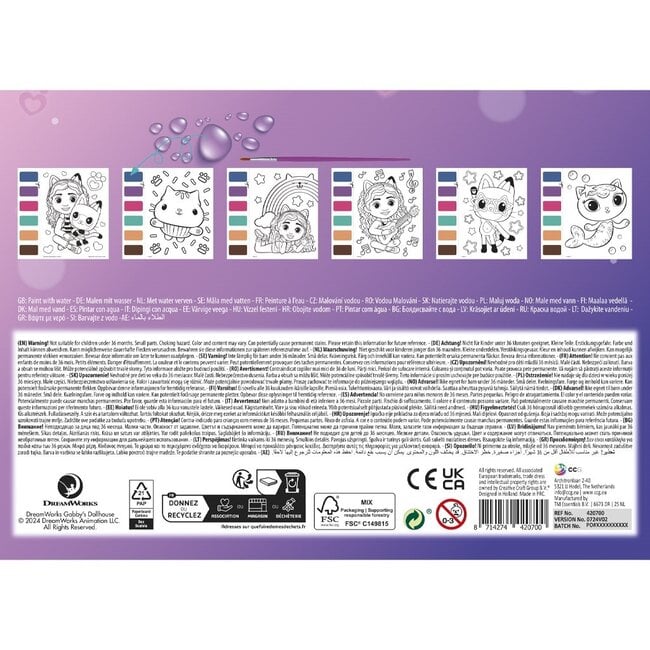 Exploreaza lumea magica a Gabby Dollhouse cu acest set creativ de pictura cu apa! Setul include 6 planse captivante, fiecare cu imagini din universul Gabby Dollhouse, care prind viata atunci cand sunt colorate cu apa. Copiii pot folosi pensula inclusa pentru a adauga culoare si a crea opere de arta vibrante. O activitate creativa si relaxanta, perfecta pentru dezvoltarea abilitatilor de motricitate fina si a imaginatiei celor mici. Ideal pentru fanii Gabby Dollhouse, acest set este perfect pentru a petrece momente de distractie si invatare. Include : 6 planse, pensula, Varsta recomandata: 3 ani+ Atentie! Contraindicat copiilor mai mici de 3 ani. Jucaria/produsul poate contine piese mici care se pot inghiti sau inhala existand pericolul de sufocare sau nu este potrivita copiilor mai mici de 3 ani. Este recomandat să supravegheați copilul în timpul jocului sau utilizării acestui produs. Pastrati instructiunile si etichetele pentru referinte viitoare.