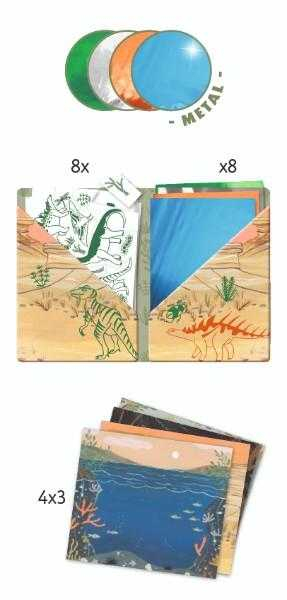 Setul conține 4 x 3 planșe de fundal, un plic cu 8 foițe metalice, 8 coli cu stickere individuale.