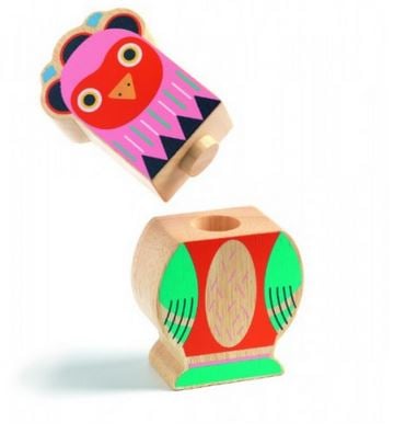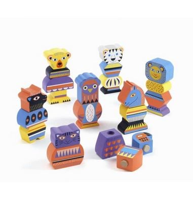 Set cu 21 de piese din lemn care se îmbină între ele pentru construi animale colorate.