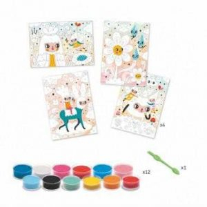 Jocul conține: 4 planșe de decorat (porțiunile care urmează a fi decorate cu nisip sunt autoadezive), un instrument de lucru (pentru dezlipit folia autocolantă), 12 cutiuțe cu nisip, manual cu instrucțiuni prin imagini, pas cu pas. Cutia are o mică fantă la unul dintre colțuri pentru a recupera cu ușurinţă nisipul.