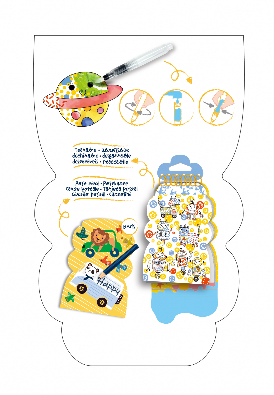 Fiecare set vine cu tot ce este necesar pentru a începe imediat: foi de desen, pensule și suporturi pentru apă. Tematica aventurii îi va captiva pe cei mici, transportându-i într-o lume plină de imaginație și culoare.