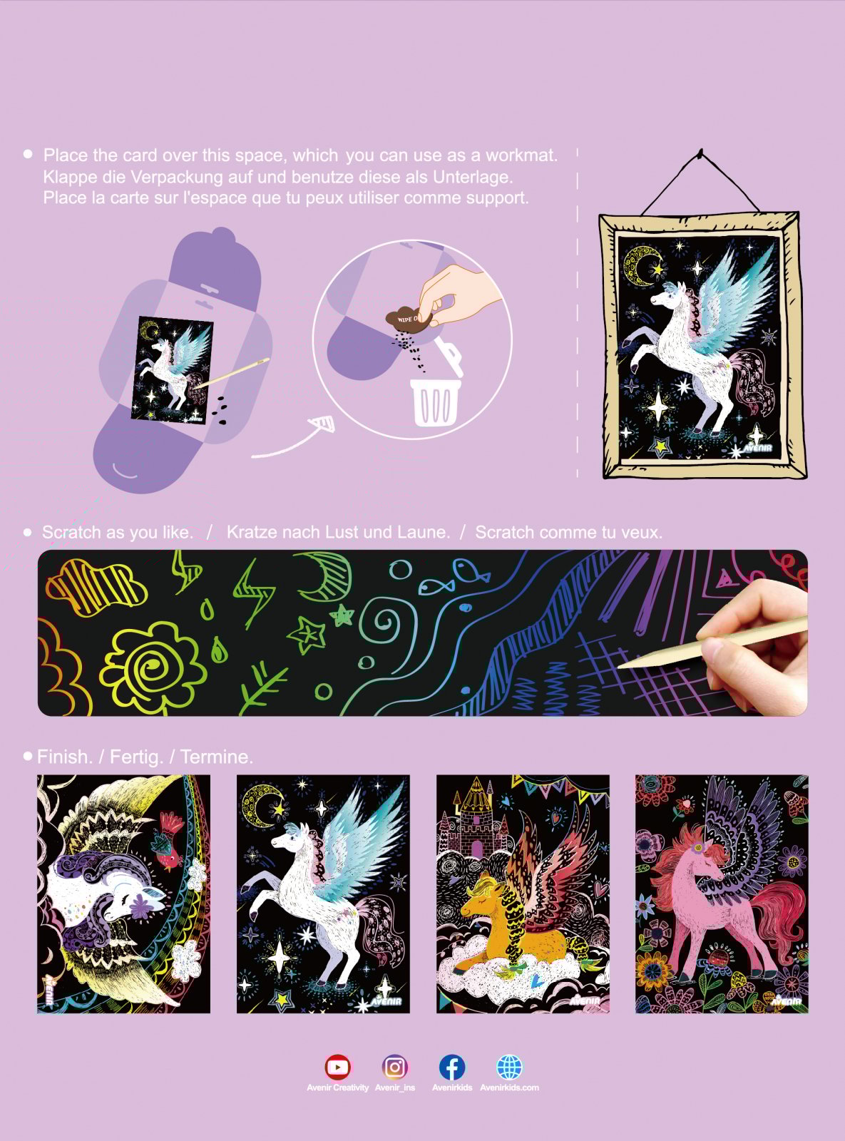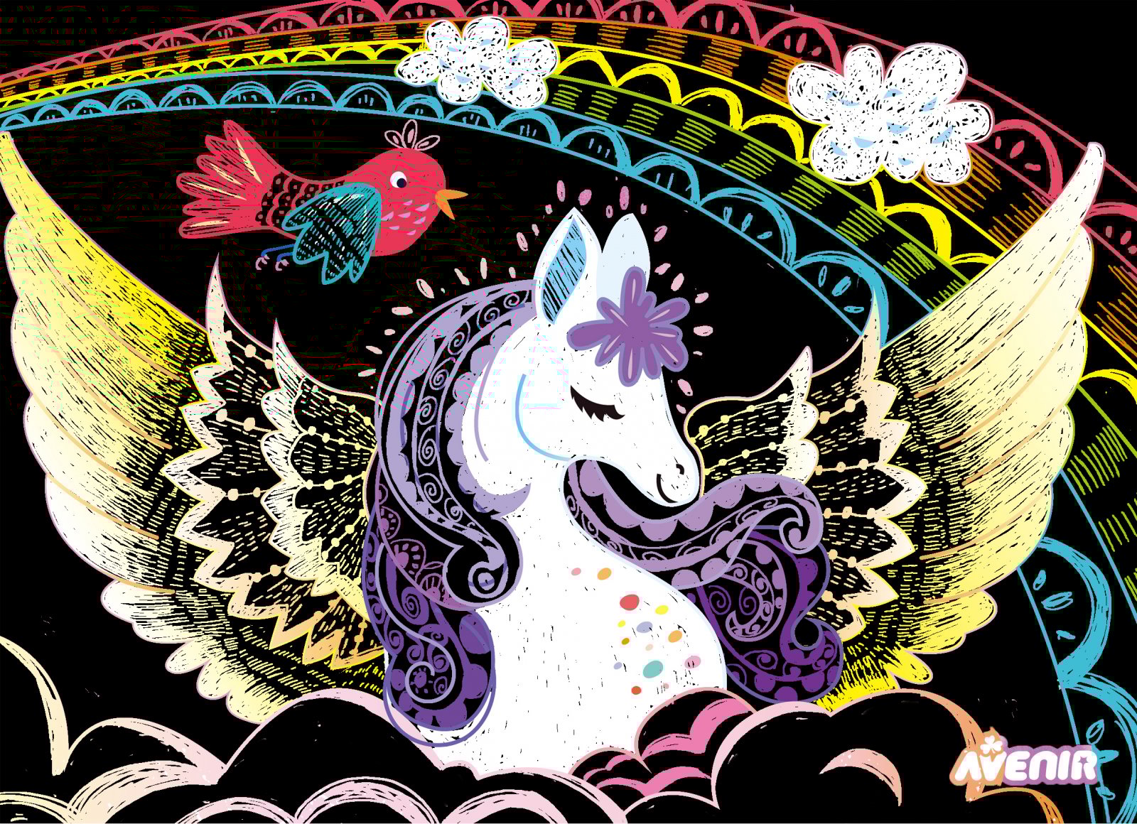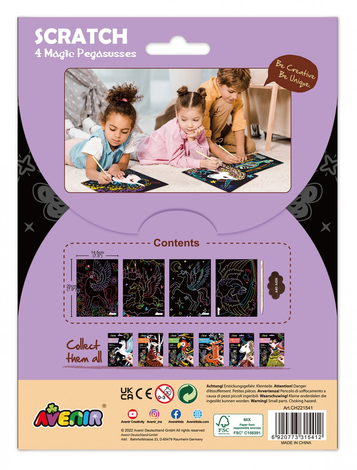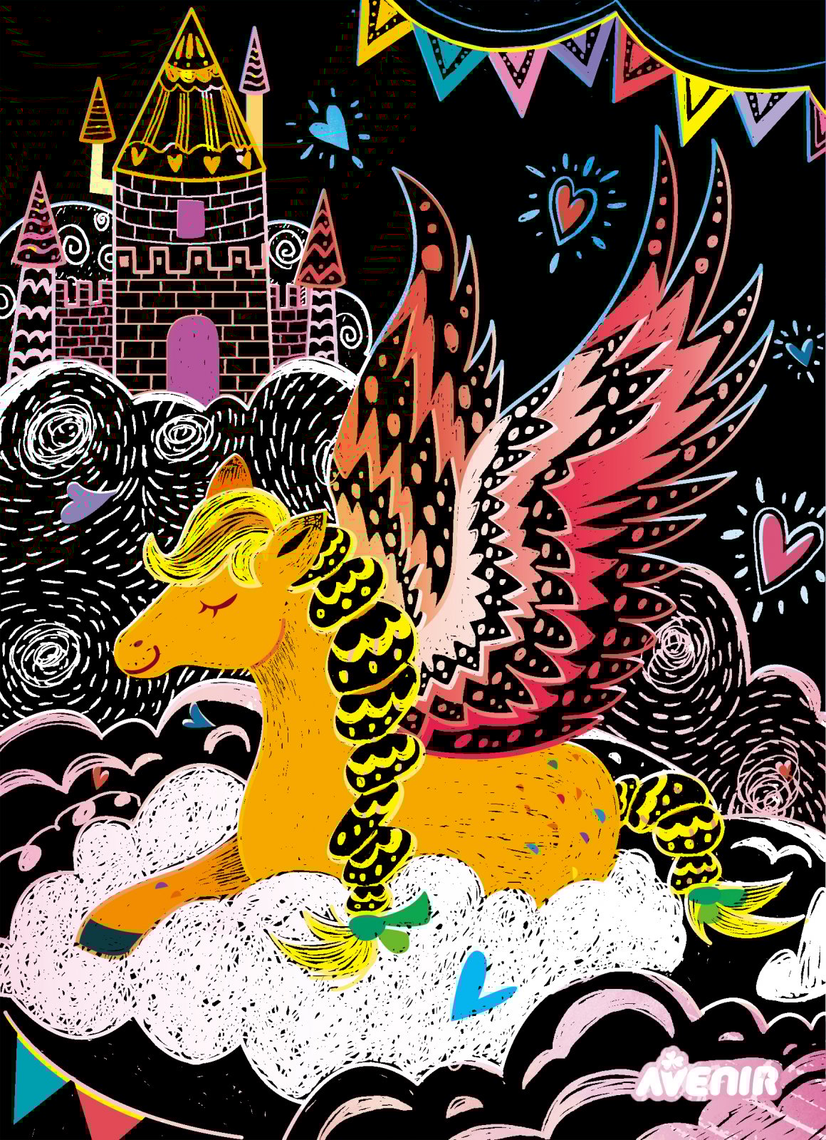 Creați opere de artă frumoase cu acest set Scratch Art de la Avenir. Tot ce trebuie să faceți este să zgâriați suprafața neagră cu stiloul de zgârietură inclus pentru a descoperi un design uimitor viu colorat. Acest set de artă captivant constă din patru Pegasuri diferite de zgâriat și dezvăluit.