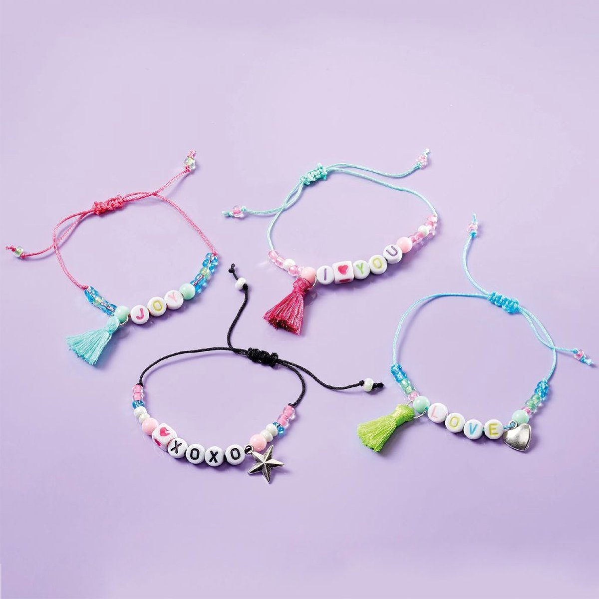 Include: ata, margele colorate, pandantiv argintiu stea si inima, ciucuri, margele cu mesaj XOXO, Joy si I love you.